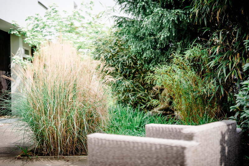 Mit Bangkirai (eine ursprünglich in Südostasien beheimatete Pflanze), Bambuspflanzen und einer Buddha-Statue ist die Gestaltung der Anlage nun asiatisch inspiriert.